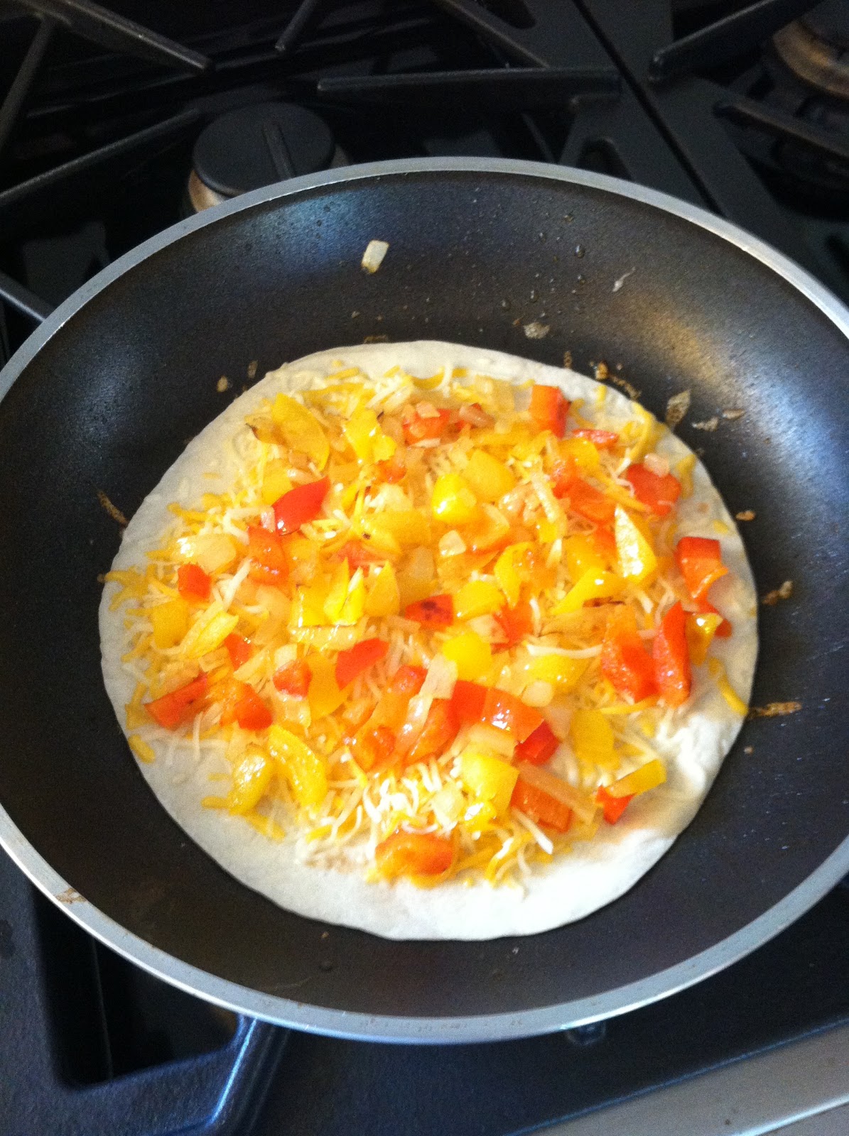 I let the veggies simmer on low heat until the onion turned a golden brown. One fully cooked, I added the veggies and some cheese on top of a tortilla...